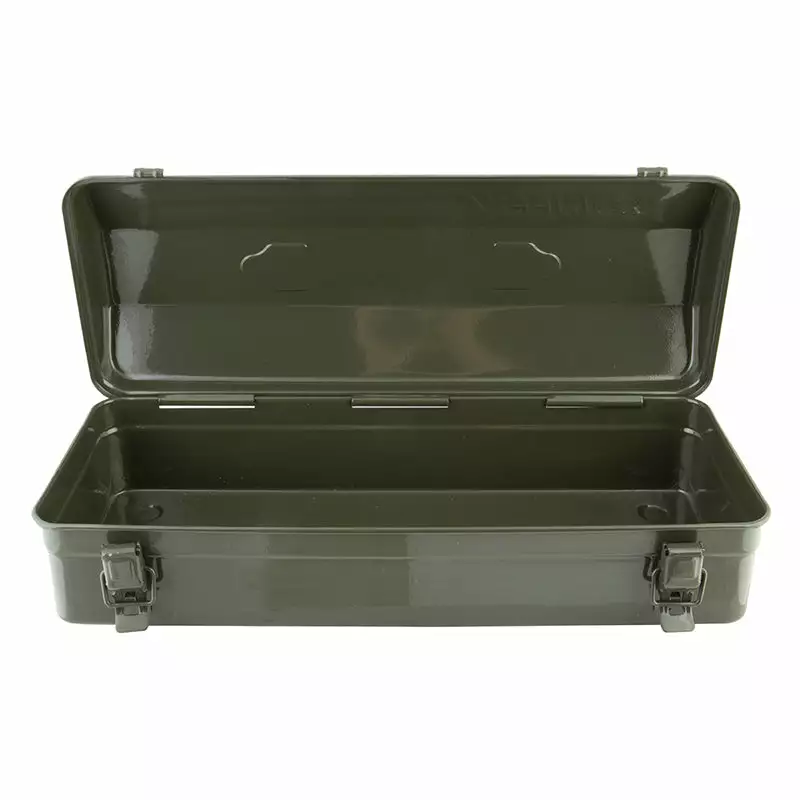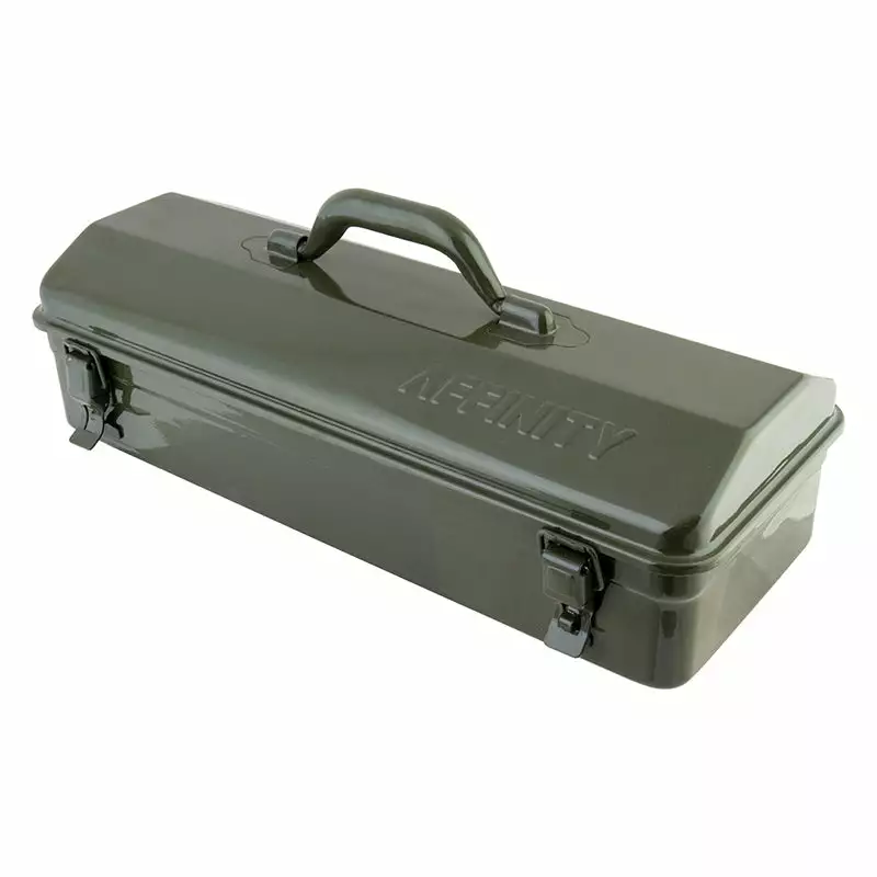 Single open section toolbox, galvanized, stamped with Affinity graphics and powder coated drab green