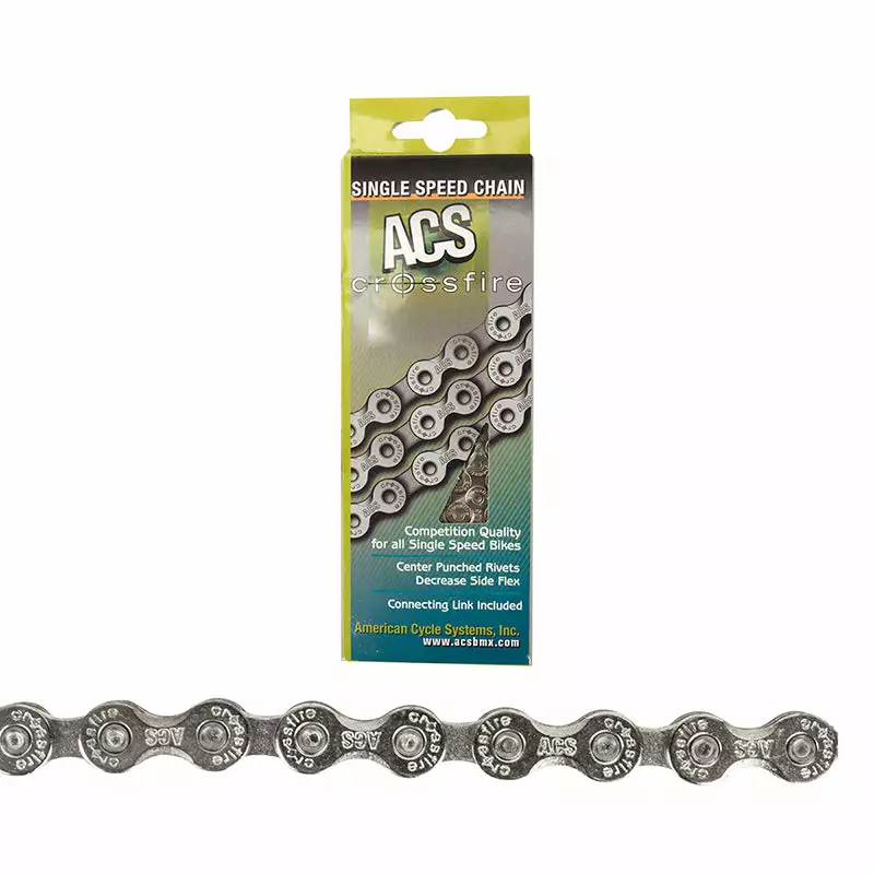 ACS Crossfire Single Speed Chain. High-strength for high-torque riders. Chamfered plates for quiet engagement. Center-punched pins for lateral stiffness includes half-link connector. 106 links to fit BMX, Cruiser, Fixie and more.