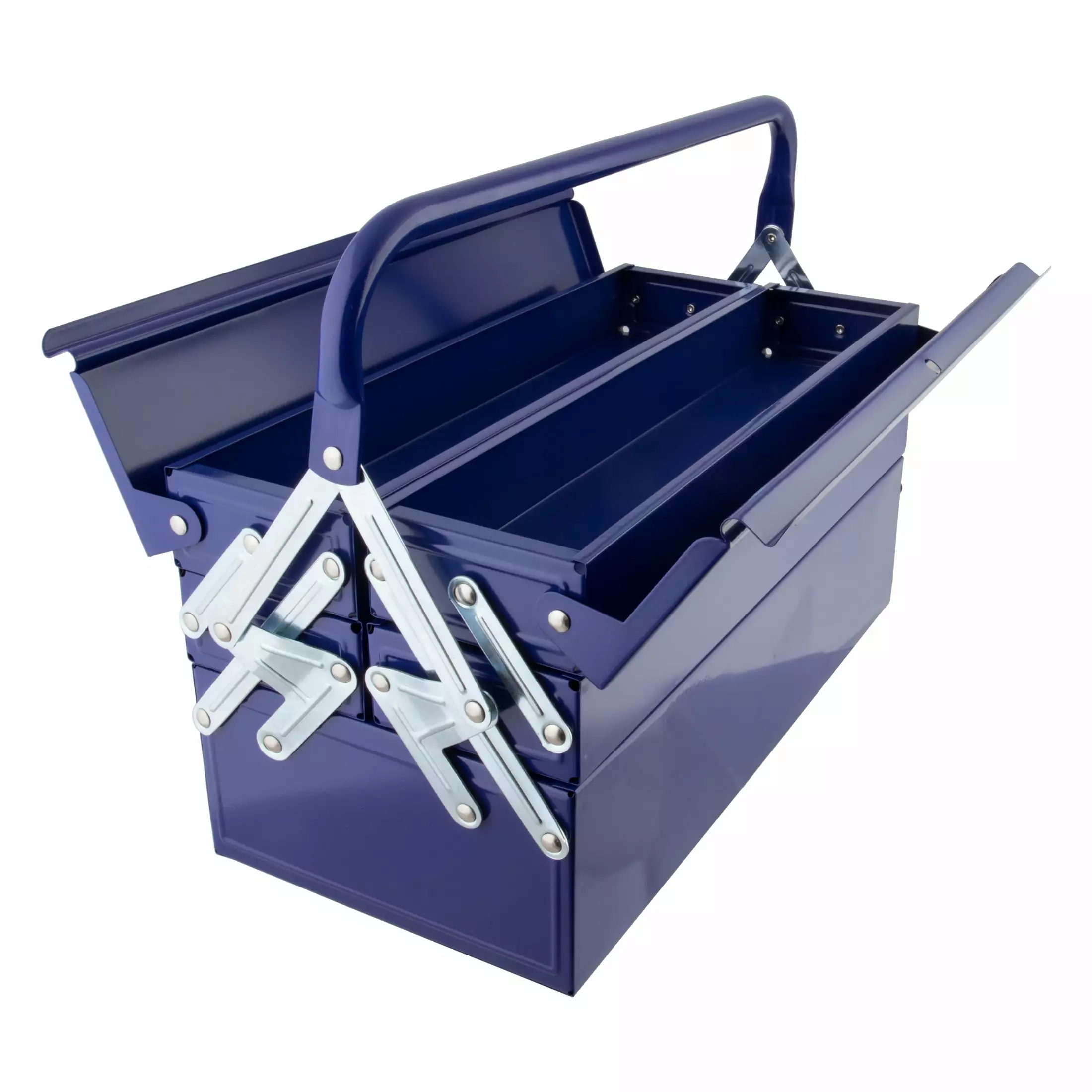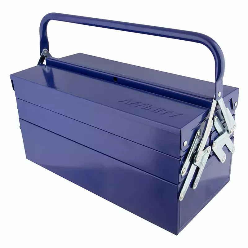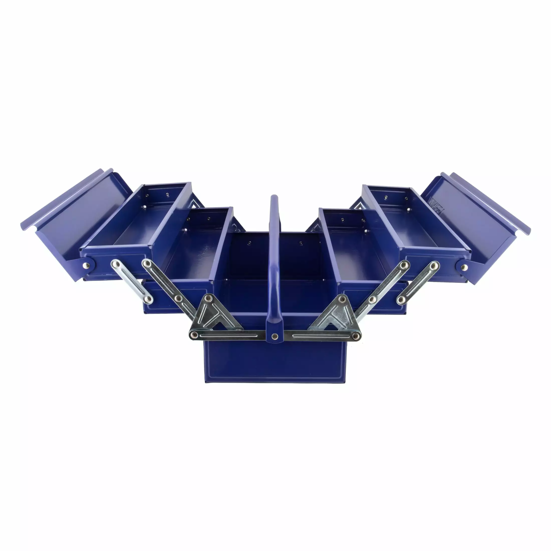 3 Tier cantilever tool box with large bottom section and two smaller levels that fold out and create a total of 5 compartments