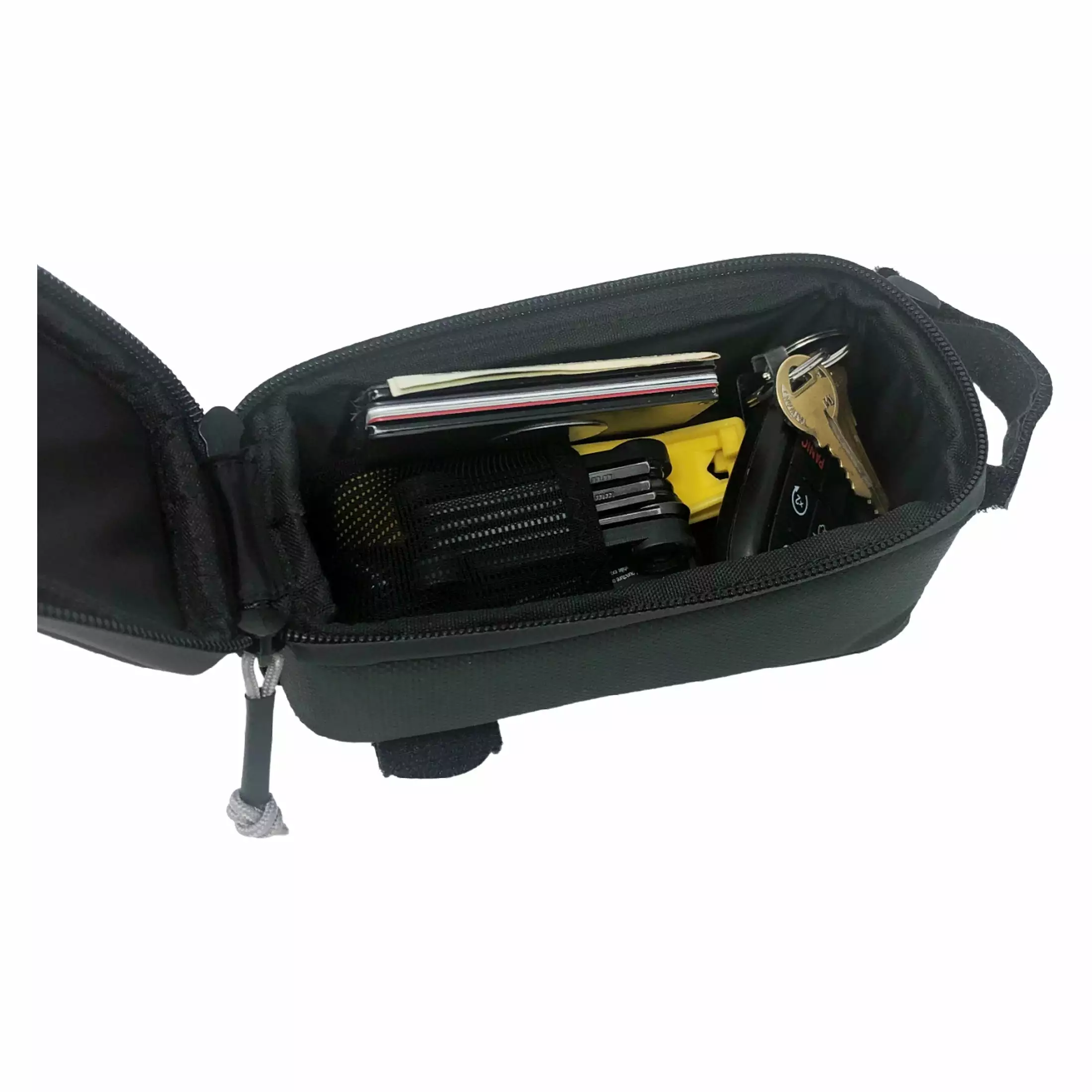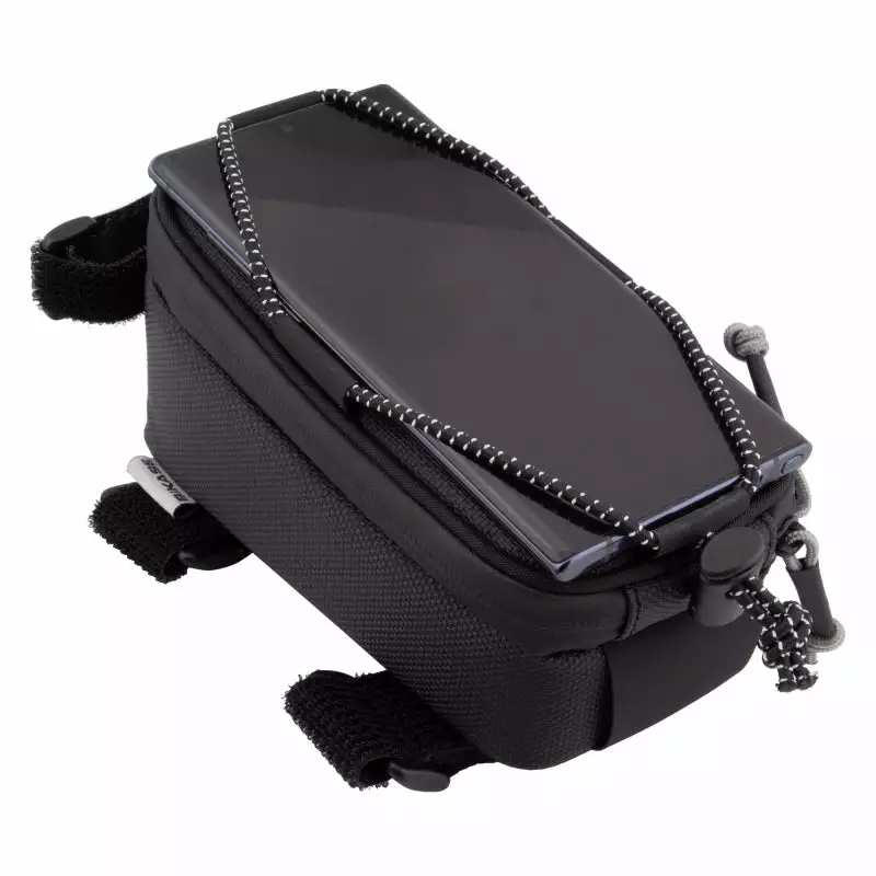 Single compartment top tube bag with an integrated elastic shock cord phone holder