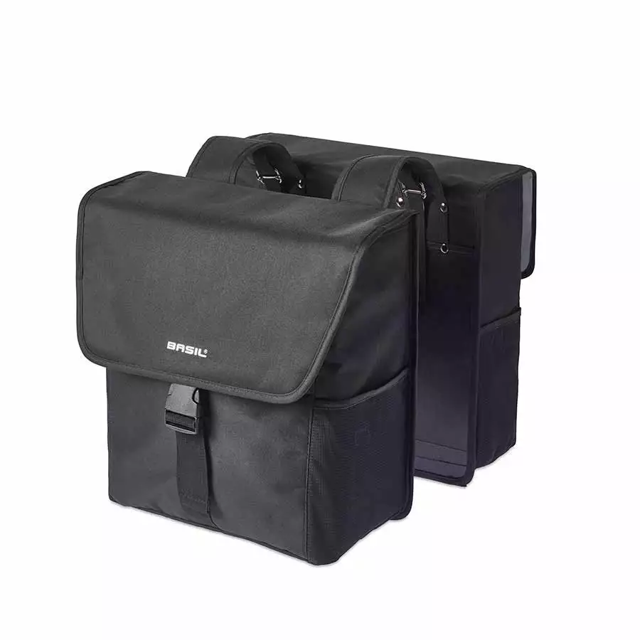 Basil Go Double Bag Pannier Bags. Double bag, high-graded material. Main compartment with pull cord. Double side pocket. Topside with two bands for LED/straps/childs seat/spring clamp. Safety reflection. Strap mounting system.