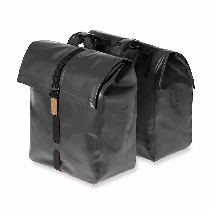 Basil Urban Dry Double Bag Pannier Bags. Waterproof (IPX3) Welded construction. 100% tarpaulin. LED mounting possibility. 50L capacity. Strap mounting system. Aluminum buckle.
