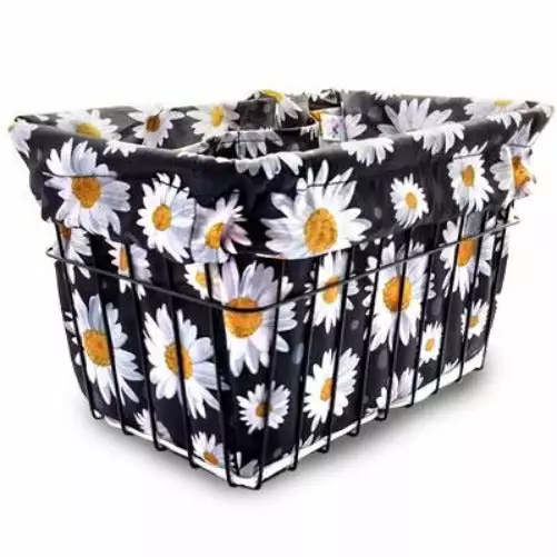This awesome Black Bicycle basket liner is the ultimate cruiser bike accessory. The Cruiser Candy Basket Liner is all weather friendly, reversible and crafted in nylon rip-stop material with durable sturdy draw straps to convert easily into a generously sized market bag, gym bag, yoga bag, beach bag, tote bag! The Cruiser Candy Basket Liner Features two deep pockets (water bottle size) Also folds up easily into a compatible zippered pouch. Easy to take in and out of bike basket.ย Basket not included.