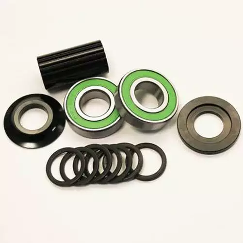 European or MID B.B. Fits 48 mm spindles. Includes 2 bearings, 2 covers (MID) or 2 cups/lockrings (Euro). Center spacer and all necessary shim spacers. European model also includes B.B. cups.
