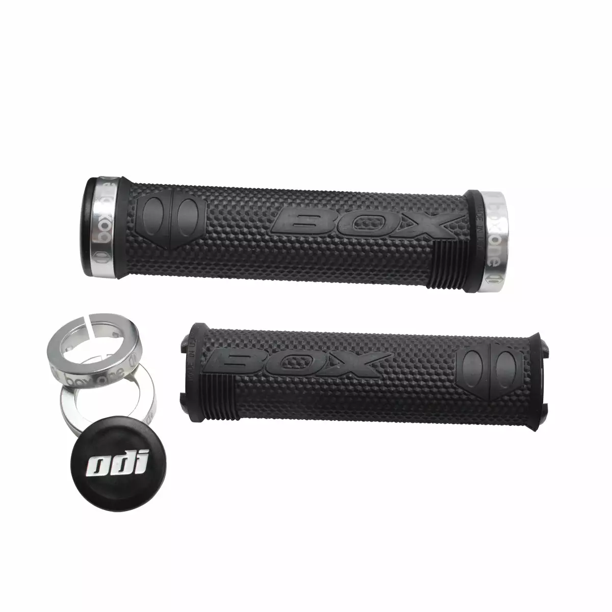 BOX Componentsย One Grips w/ Clamps Combo Set. ODI Lock-On grip clamps with laser-etched Box logos.ย Two Snap Cap end plugsHexagonal textured pattern over more than 85 percent of the grip. Comfort ribs support and cushion the rider-s thumbs. Works seamlessly with genius brake levers and the new genius grip clamps. Brakes levers and grips are sold separately.