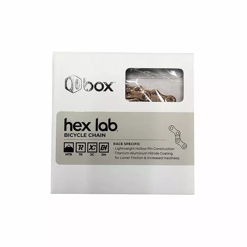 BOX Componentsย Hex Lab 11 Speed Chain Hollow Pin 126 Links.ย Titanium Aluminum-Nitrideย coating increases hardness and reduces friction. Heat treated alloy steel. Solid inner and outer plates with Hollow pins.