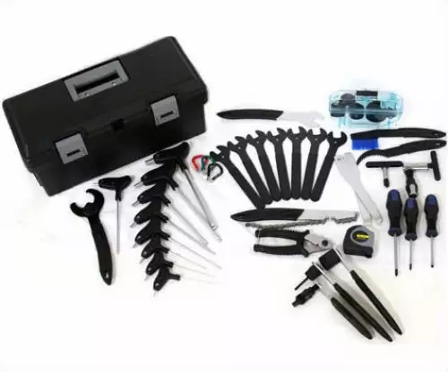 The BSC 38 Piece Professional Bicycle Tool Set is the ”must have” for any home mechanic! The BSC 38 Piece Professional Bicycle Tool Set includes 1 tape measure, 1 chainring nut tool, 3 spoke wrenches (3.2mm, 3.3mm, 3.5mm), 1 chain break, 2 philips screwdrivers, 1 flathead screwdriver, 2 large tire levers, 1 chain scrubber, 1 gear brush, 1 cog brush, 1 cassette tool, 1 crank puller, 1 ISIS BB tool, 1 external BB tool, 1 pedal wrench, 1 chain whip, 1 T/L handle T25 torx wrench, 1 cable cutter, 7 open-end wrenches (13mm-19mm), and 8 T/L handle Hex tools (2mm, 2.5mm, 3mm, 4mm, 5mm, 6mm, 8mm, 10mm). All comes in a nice tool box with 2 customizable shelves.