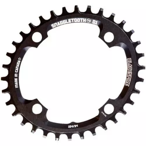 Blackspire Snaggletooth NW Chainring Oval 4 Arm 104mm 9/10/11/12 Speed. Oval rings help the rider spin smoother and generate more power. Ovality: 12%-13%, Timing of 115° after TDC (Top Dead Center). CNCd 7075 T-6 anodized with laser etched graphics Strong while remaining very lightweight. Cut from .160″ material for strength and long life. 32t cut from .3″ material (48.5mm chainline) For use with 1×9, 1×10, 1×11 or 1×12 speed drivetrains.