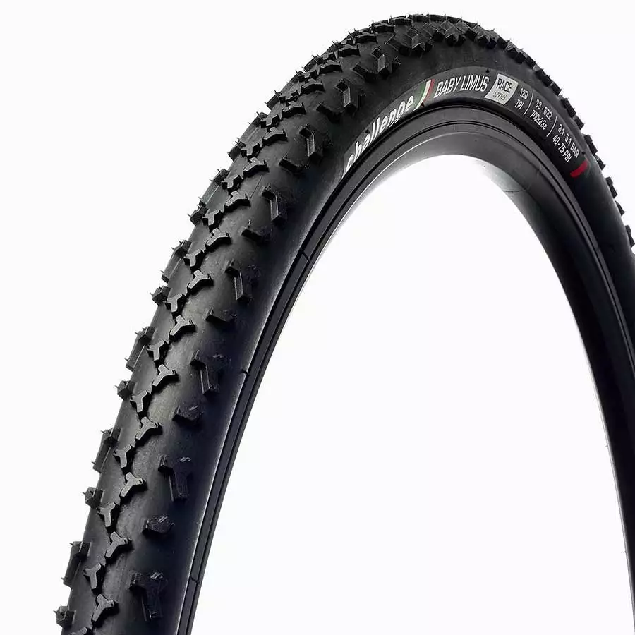 Challenge Baby Limus Race Tires 700c x 33c Folding 120TPI 40-75PSI 330g, Black. When the conditions get muddy there is only one tire to get you to the finish line, the Baby Limus Puncture protections keeps you riding and not changing flats