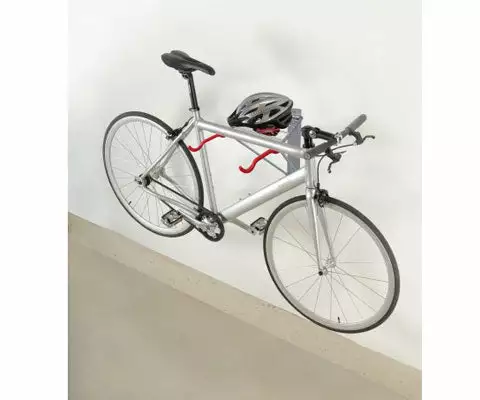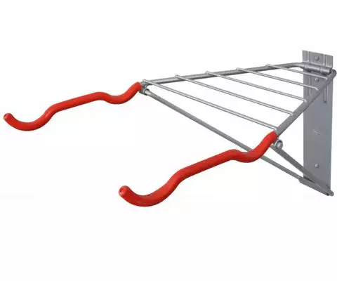 The Delta Pablo two bike folding rack with shelf stores 2 bikes. Thick vinyl coated arms protects bike finish. Folds down to save space when needed, features a durable silver finish.