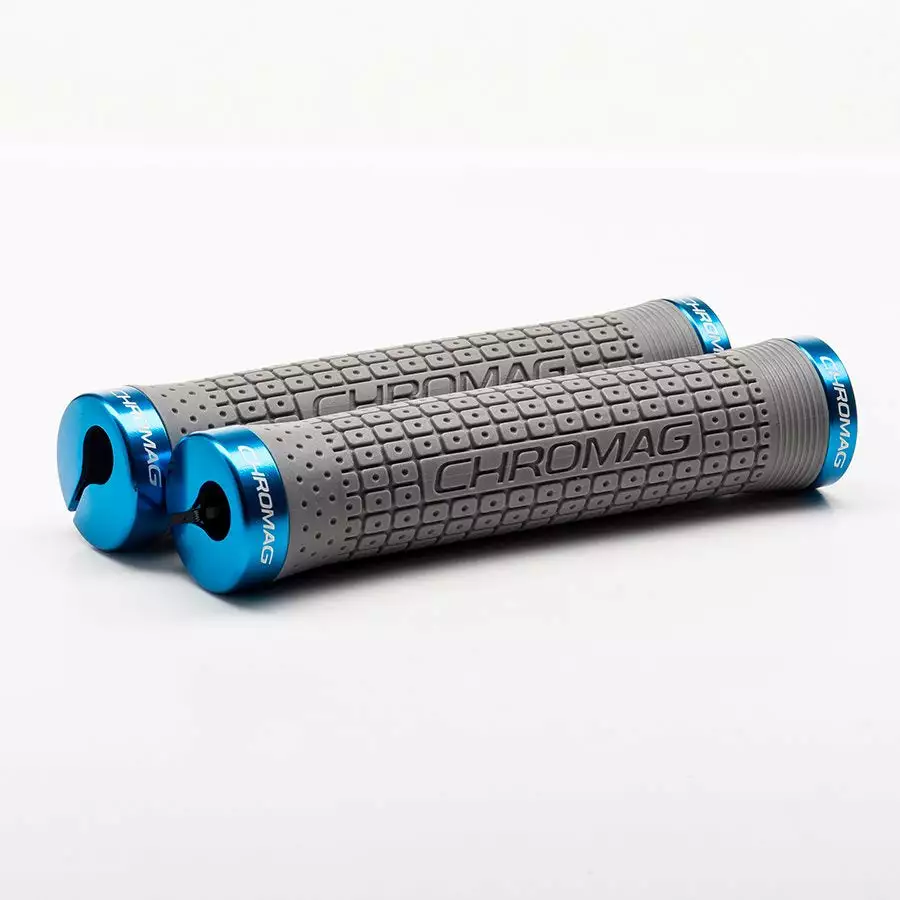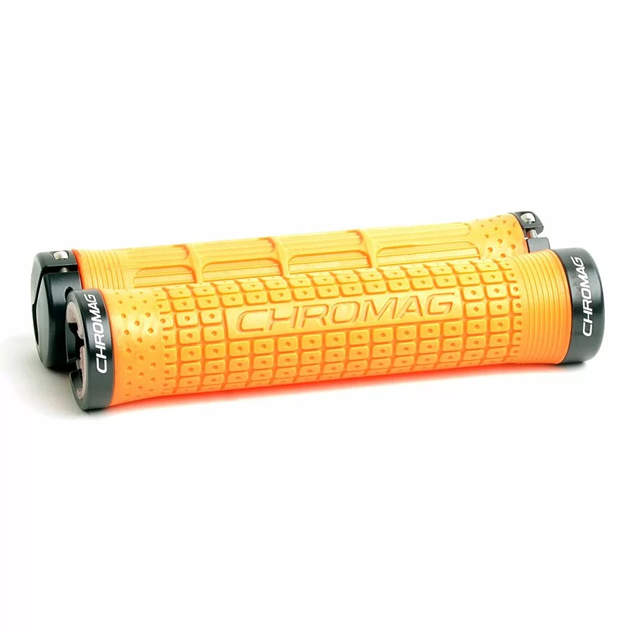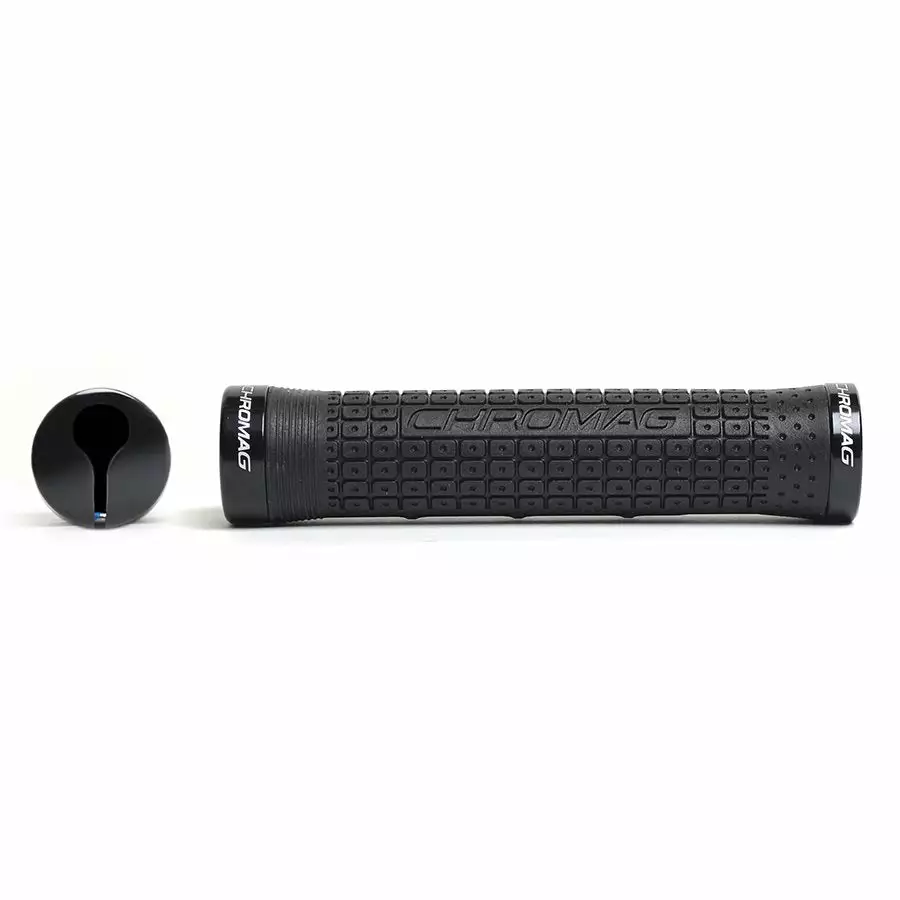 Chromag Clutch Locking Grips. Waffle tread is specifically shaped to the fingers and oriented for traction in varied conditions. Narrow 30mm diameter with an extra wide format at 150mm overall. Split-Teardrop end clamp effectively covers the bar end while utilizing a pinch-clamp for the best purchase. Weight: 100g /pair.