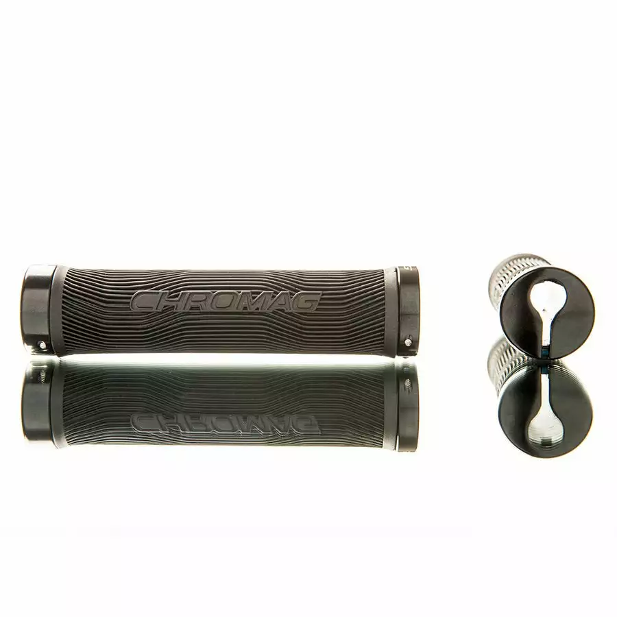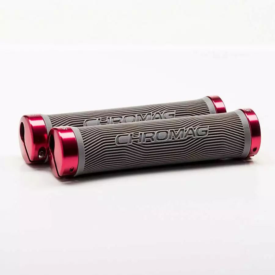 Chromag Palmskin Lock On Grips w/ Clamps. For riders who like a softer, supple feel and may prefer not to use gloves. Compliant under the hand while managing moisture by channeling it away into the groove. A soft 25a durometer is combined with a proprietary additive for a combination of tackiness and durability. Split-Teardrop end clamp effectively covers the bar end while utilizing a pinch. clamp for the best purchase.