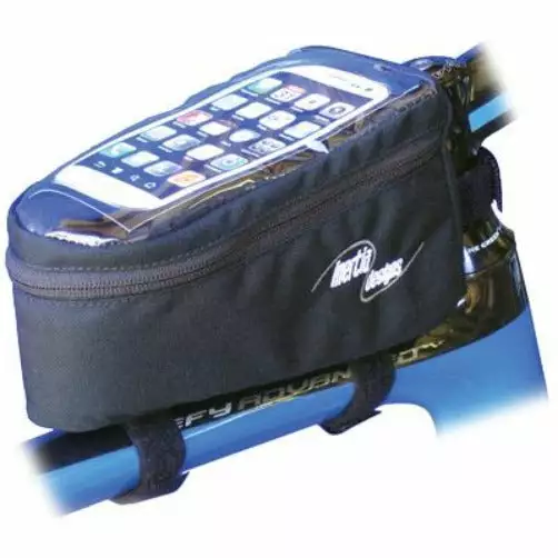 Inertia Designs Tri-Phone Standard Bicycle Bag. Original size fits iPhones and most other smart phones. Clear marine-grade vinyl protects phone from the elements, but still allows use of the touch screen. Small slot for earphones. Three hook and loop straps secure the bag to top tube and stem. Foam sides and truck tarp interior keep the phone safe, even if your bike takes a beating.