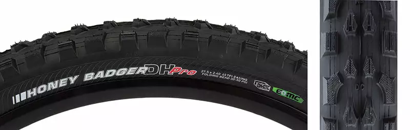Kenda Honey Badger Dh Pro Tires 27.5″ x 2.40 Folding DTC E-Mountain Casing (E-BIKE) 60TPI, Black. Tri-bite knobs running down the center for fast rolling speed and sipped to open up under heavy braking loads.
