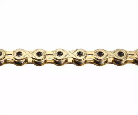 The KMC X101 Single Speed Chain is a Hi-Performance chain that features Triple X technology for unsurpassed durability, hollow inner plates to help reduce weight, and Double X Bridge shape and inner plate chamferring allow for smooth and fast shifting. The KMC X101 Single Speed Chain is the perfect choice for your single speed MTB, BMX, fixie or track bike. The KMC X101 Single Speed Chain Gold model features a Ti-N (Titanium Nitrate Coating) that provides even more chain hardness, smoother shifting, and prolonged chain life, just a step above the nickel plated Silver model.