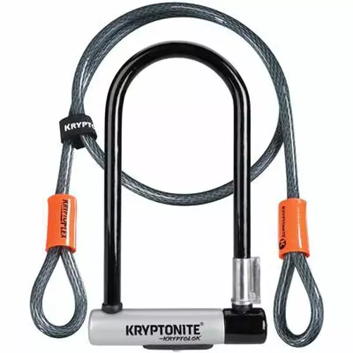 Kryptonite Kryptolok Standard U-Locks w/Flex Cable have a 12.7 mm hardened performance steel shackle. New hardened double deadbolt design. Provides additional protection against cut & twist attacks. Includes Frameflex-U bracket. New sliding dust cover. 2 stainless steel keys. Includes 4′ Kryptoflex double loop cable.
