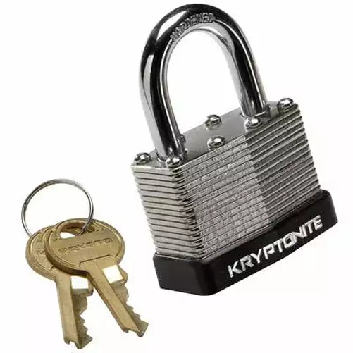 Kryptonite Laminated Key Padlock. Laminated steel pad locks with plated steel body. Double deadbolt locking mechanism for increase strength. Hardened steel shackle.