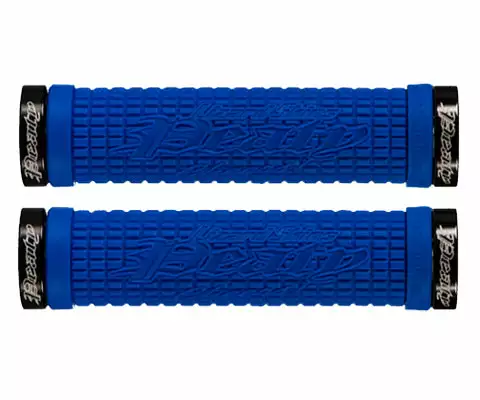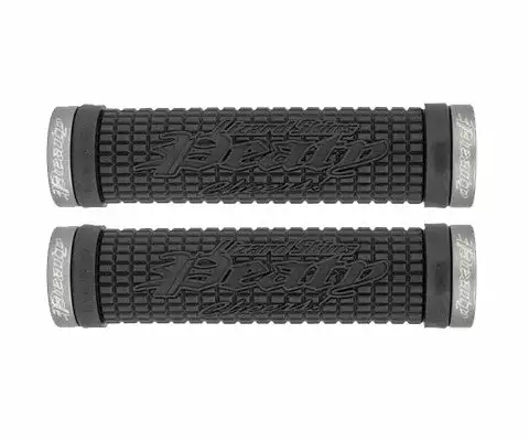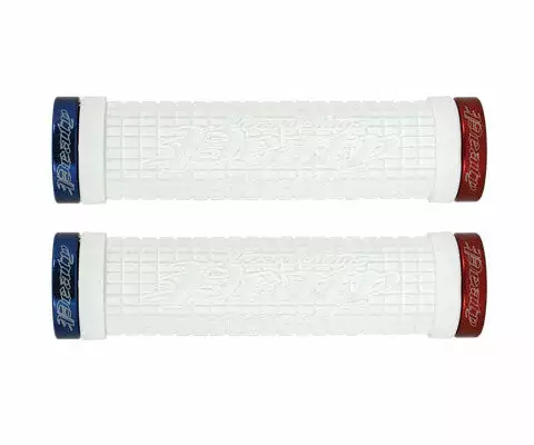 The Lizard Skins Peaty Lock On Grips are Steve Peat inspired signature grips. White Lizard Skins Peaty Lock On Grips come with anodized red and blue rings and the graphite grips come with anodized red rings.