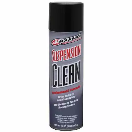 Maxima SUSPENSION CLEAN is specifically formulated for the industry professional. Suspension Cleans unique formula quickly and easily cleans suspension internally and externally leaving a dry, residue free surface. Professional formula integrates strong industrial cleaners with a powerful spray. Overspray will not harm o-rings or most seal materials. Displaces moisture.