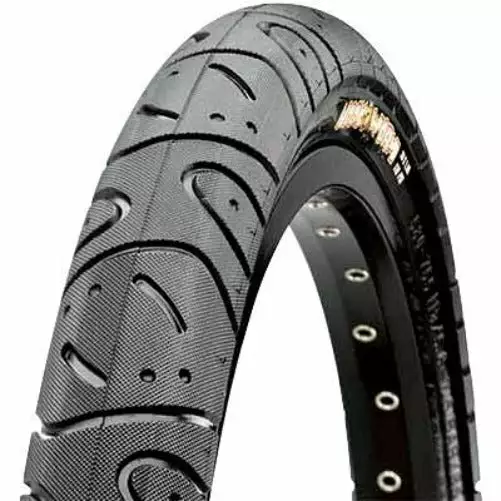 The Maxxis Hook worm Tire is the original urban assault tire, designed to take the abuses of the most aggressive street riders. Huge air-volume softens the drops, while the inverted tread design makes rolling resistance minimal. Bead-to-bead tread provides durability and traction whether you’re dropping staircases, grinding rails or riding in your local skatepark.