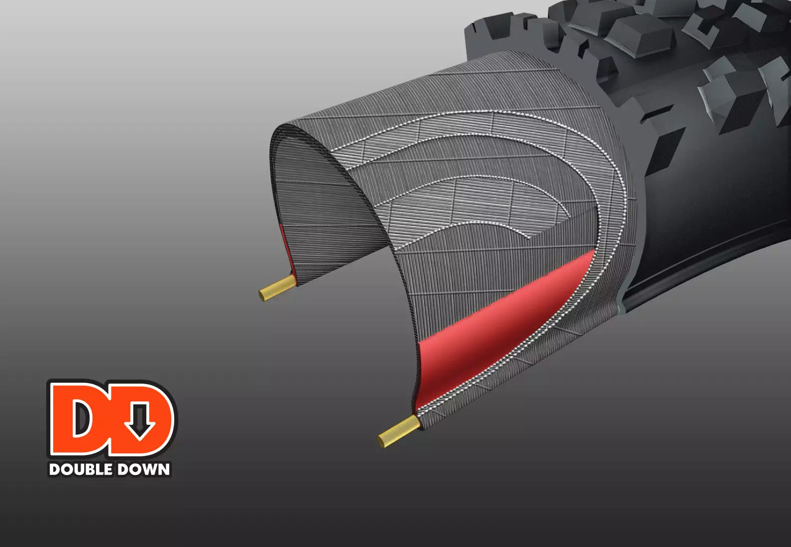 DoubleDown (DD) is the next step in the evolution of the dual-ply tire casing for enduro racing. Two 120 TPI casing layers reinforced with a butyl insert provide the enduro racer with the support and protection of a downhill tire, but in a lighter package.