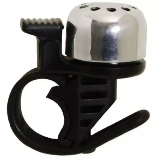 Mirrycle Bicycle OmniBell Bell has a Silver dome. Attaches in seconds. Fits 22.2-31.8 mm bars.