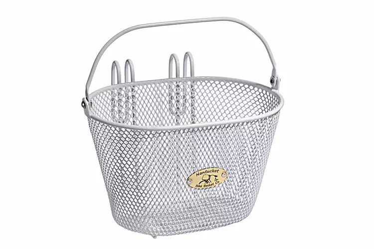 Nantucket Surfside Child Mesh Wire Front Bikeย Basket. Attaches to the front handlebars with two simple hooks. Features a carrying handle. Weight limit: 8 pounds.