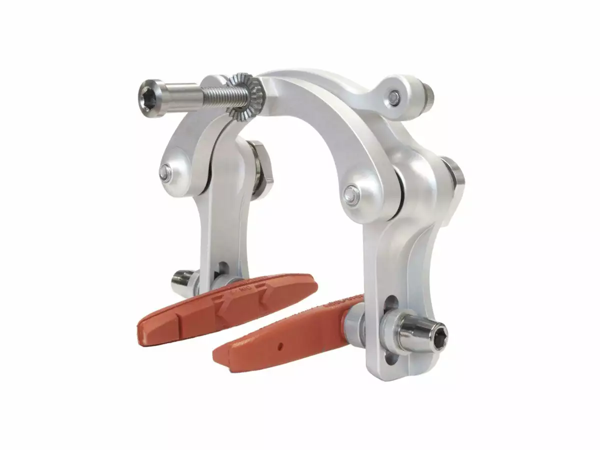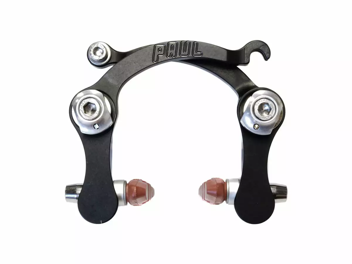 Paul Components Racer Center Pull Brakes. Calipers areย 6061 Aluminum. Anodized or polshed finish. Black or silver anodized color. Long reaching arms are CNC machined with T-shape profile. Widely space pivots make room for larger tires and full-coverage fenders. Mounts directly to the frame via center pull brake bosses. Does not mount to brake bosses in the standard cantilever position. Nor will it work on U-brake bosses.