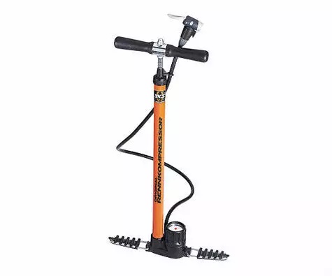 For close to 40 years, the SKS Rennkompressor Floor Pump has been the most popular pump in international cycling and the sole legitimate ancestor of all floor pumps. The 2008 version stands proud under the authentic orange finish of the original. As a concession to modern valve technology, the SKS Rennkompressor Floor Pump will come equipped with the new E.V.A. valve head, guaranteeing the perfect connection for Presta and Schrader.