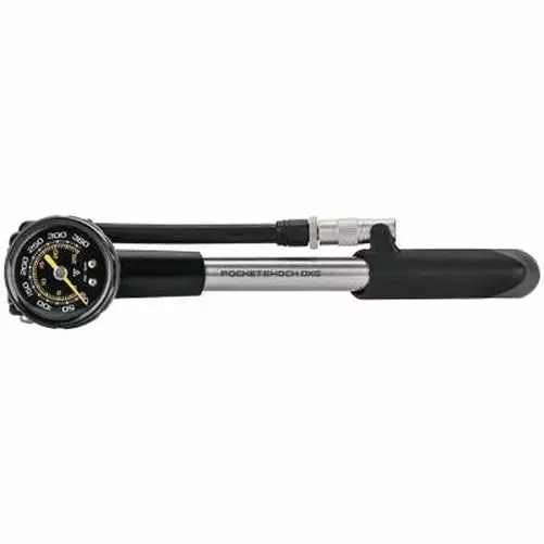 Topeak Pocket Shock DXG Fork / Rear Shock Pump 360 psi. Fork and shock pump with an extended barrel. Easy-to-read dial gauge for accurate pressure reading up to 360 psi. Air release button and pressure-rite connector makes setting proper pressure.