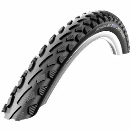 The Schwalbe Land Cruiser HS 450 K-Guard Tires 700c is even considered an MTB tire. Nevertheless, it rolls really easily on the road. New is the modern tread design and the optional Land Cruiser. Plus version with 3 mm Puncture Guard. A recommendation for E-Bikes up to 25 km/h. Schwalbe Land Cruiser Tire has a New modern tread pattern. Quiet on pavement. Diamond textured side lugs for off-road grip.