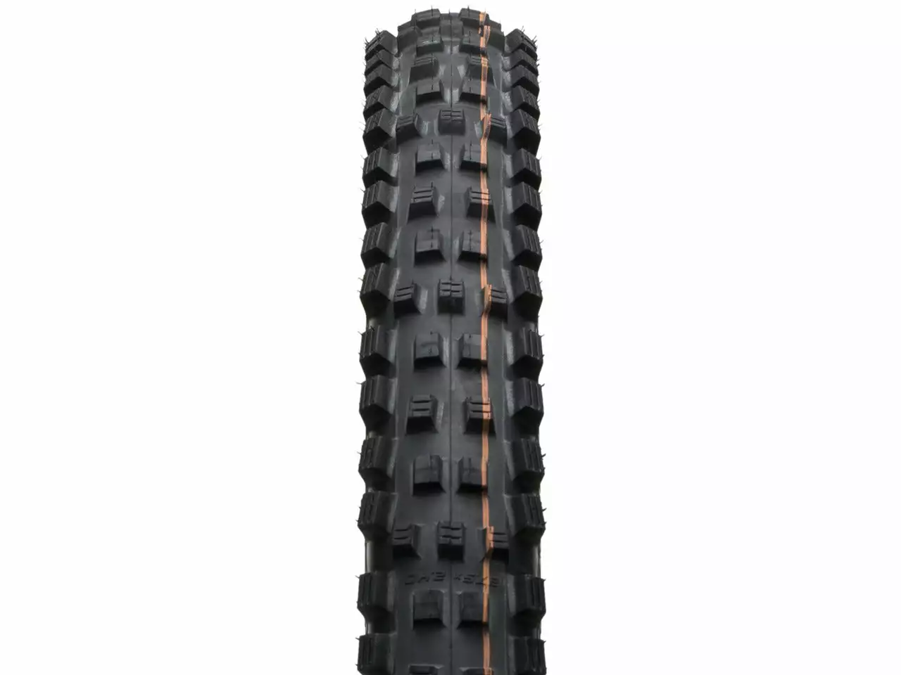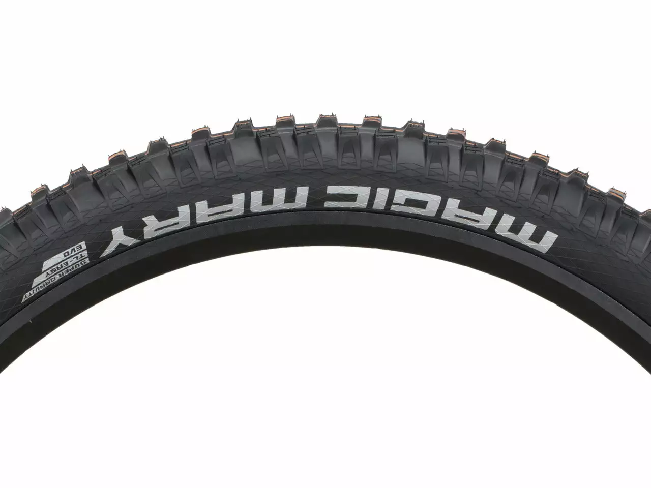 The Schwalbe Magic Mary Super Gravity Addix Soft Evolution TLE Tubeless Folding Tire 27.5″ is the perfect gravity tire thanks to its optimal all-round properties. Robust shoulder studs and the open, aggressive tread design guarantee braking traction and cornering grip even on muddy surfaces. The angled blocks in the tread center ensure fast rolling behavior, the V- Grooves in the lugs create even more grip.