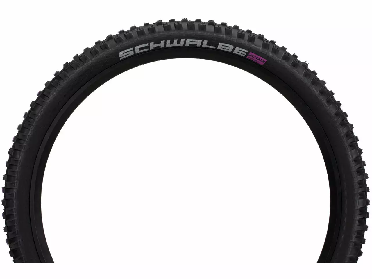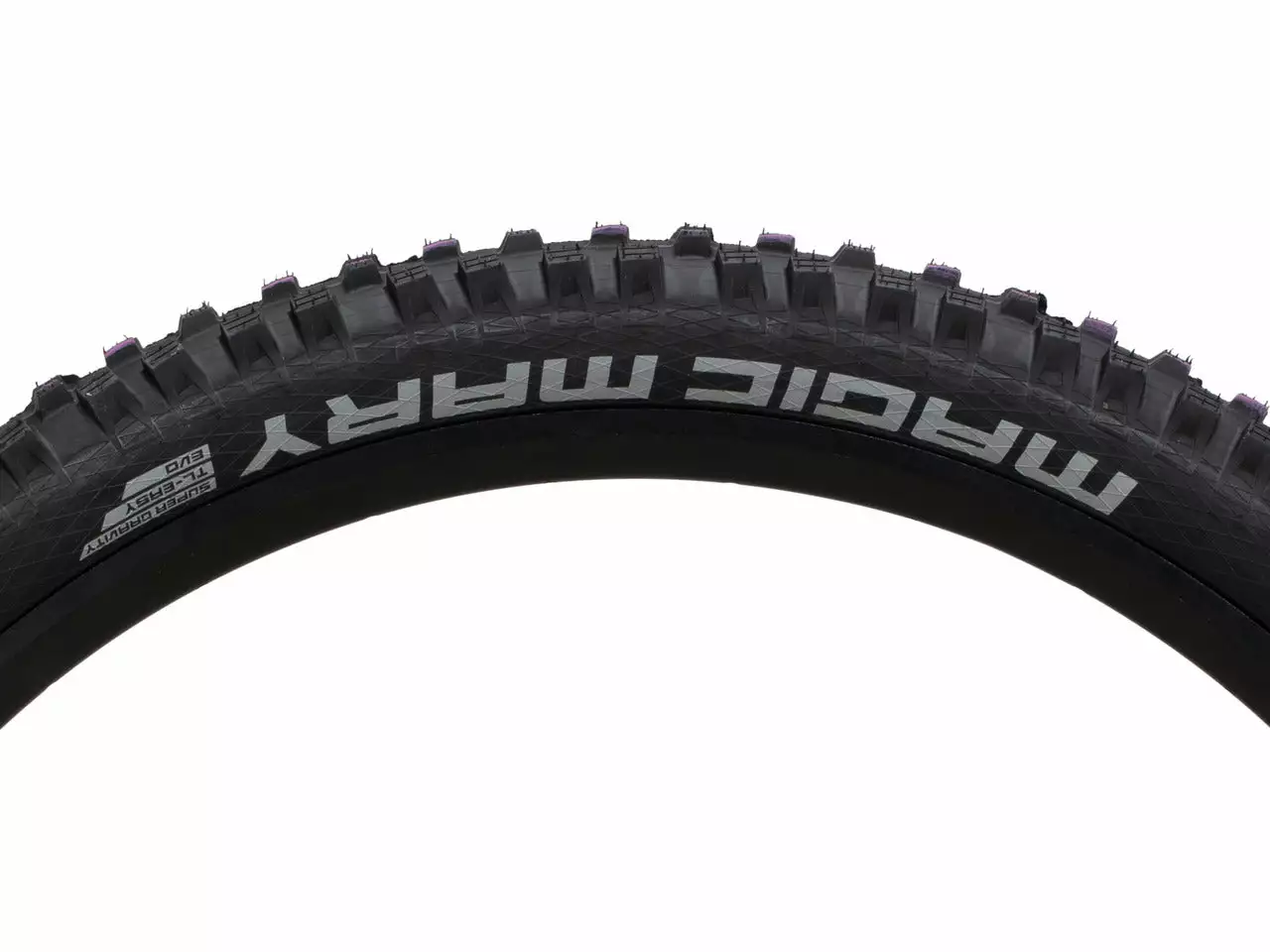 Theย Schwalbe Evolution Magic Mary Super Gravity Addix Ultra Soft TL Folding Tire 29″ is the perfect gravity tire thanks to its optimal all-round properties. Robust shoulder lugs and the open, aggressive profile design guarantee braking traction and cornering grip even on muddy ground. The angled blocks in the center of the tread ensure fast rolling behavior, the V-grooves in the studs create even more