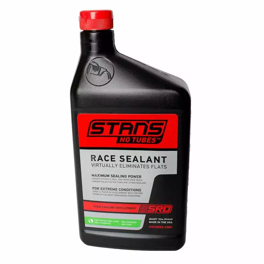 Stan’s No Tubes Race Tire Sealant 32oz. Close to twice the amount of sealing crystals plus special “XL” crystals capable of sealing even larger punctures.