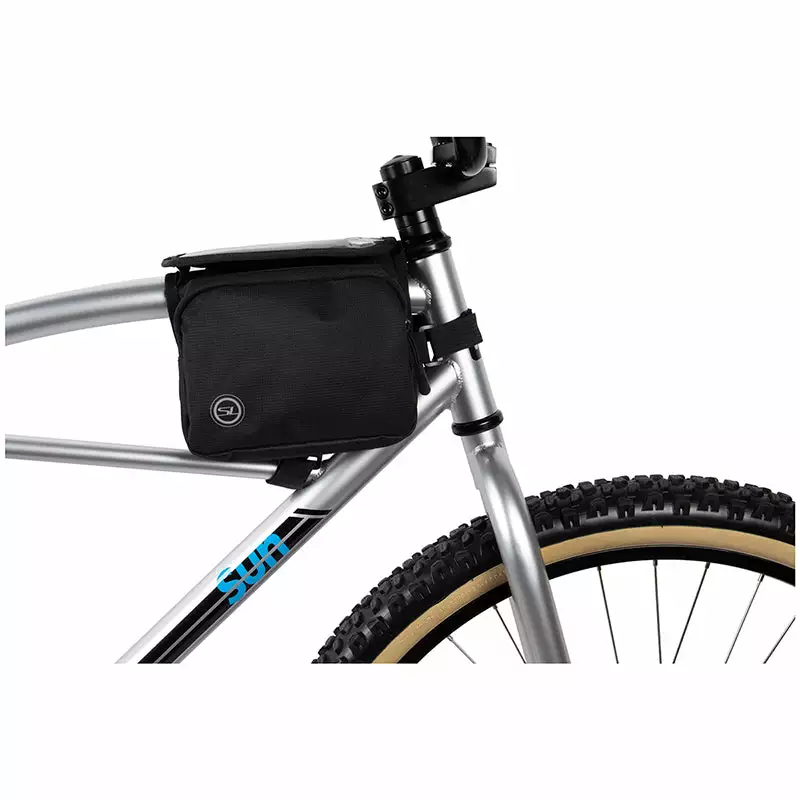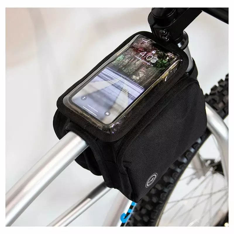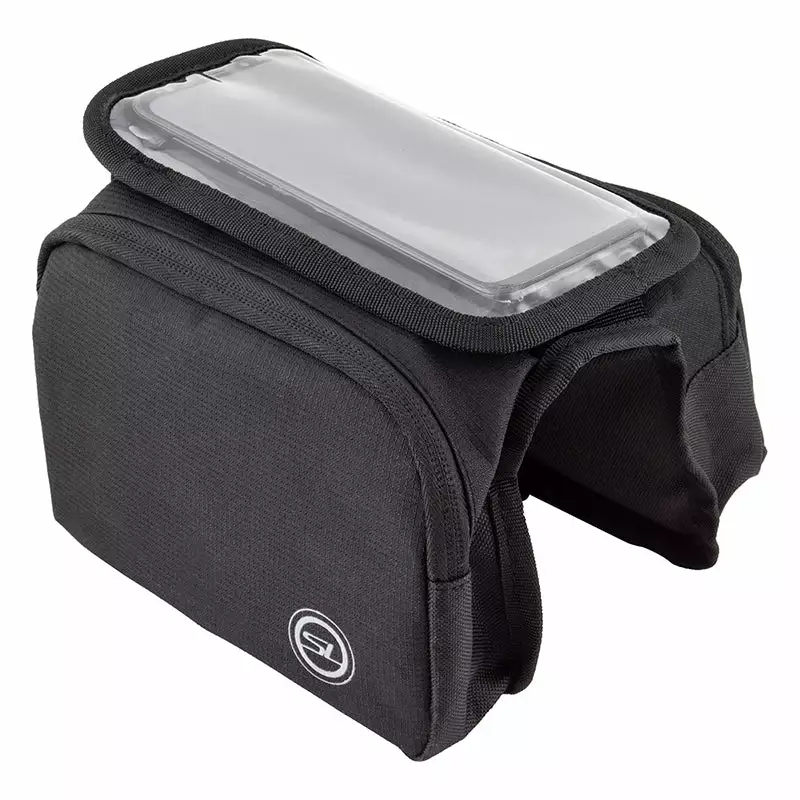 Top tube saddle bag style bag with 2 side compartments and a clear PVC phone/map pouch
