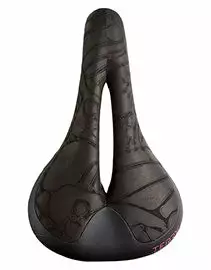 The ultimate bike seat for women, ridden and universally loved around the world. For over two decades, Terry has worked with all levels of riders and addressed all types of saddle comfort issues. Introduced in 1999, the Italian-made Butterfly represents the best in all that research and development. Wider in the rear than typical race saddles for good support of a woman’s sit bones; completely cut away through the nose and mid-section, making it flexible and comfortable against soft tissues; low profile, flat top with multi-density injection molded foam that’s a bit stiffer in the rear for more power while pedaling; ti-nox rails are super light and super strong; textured leather wears beautifully over time and keeps you in position. Black or white leather with debossed butterfly graphic. Made in Italy.
