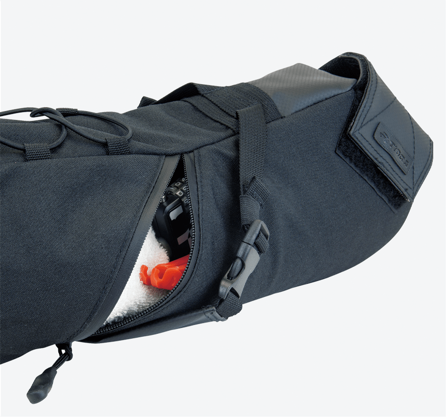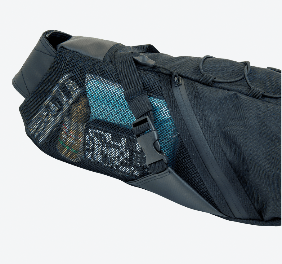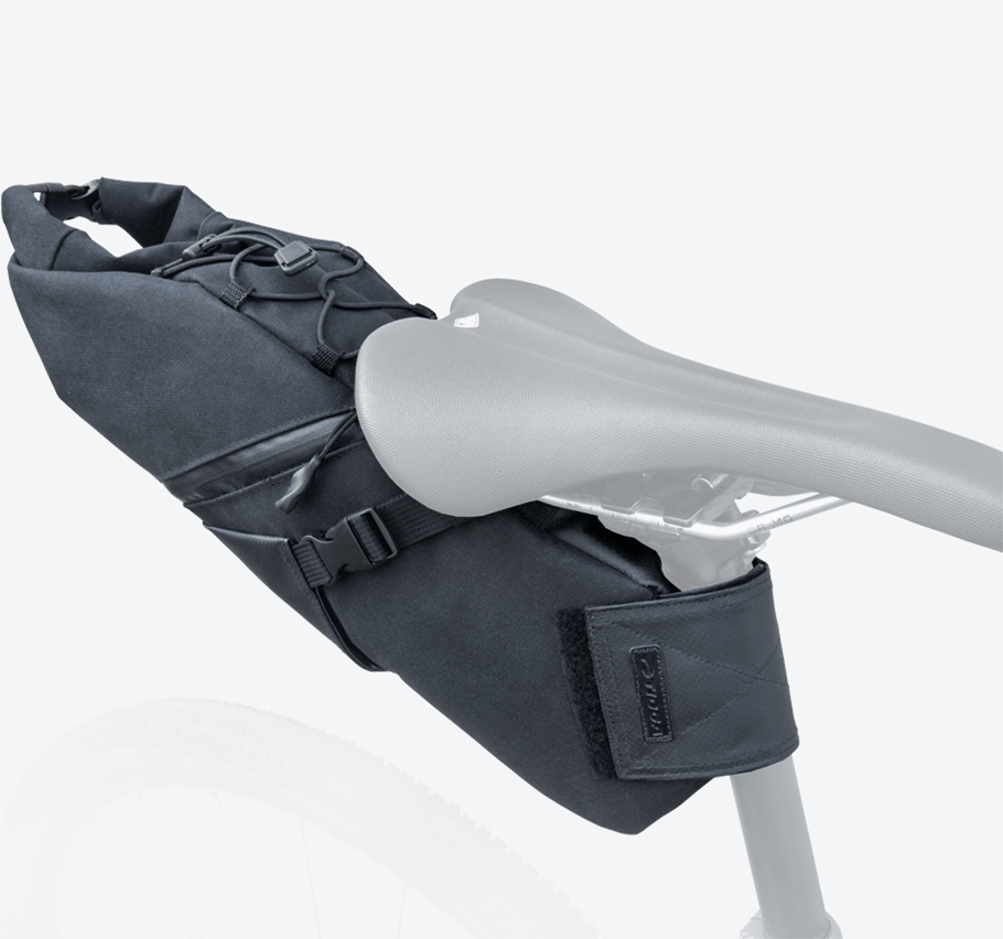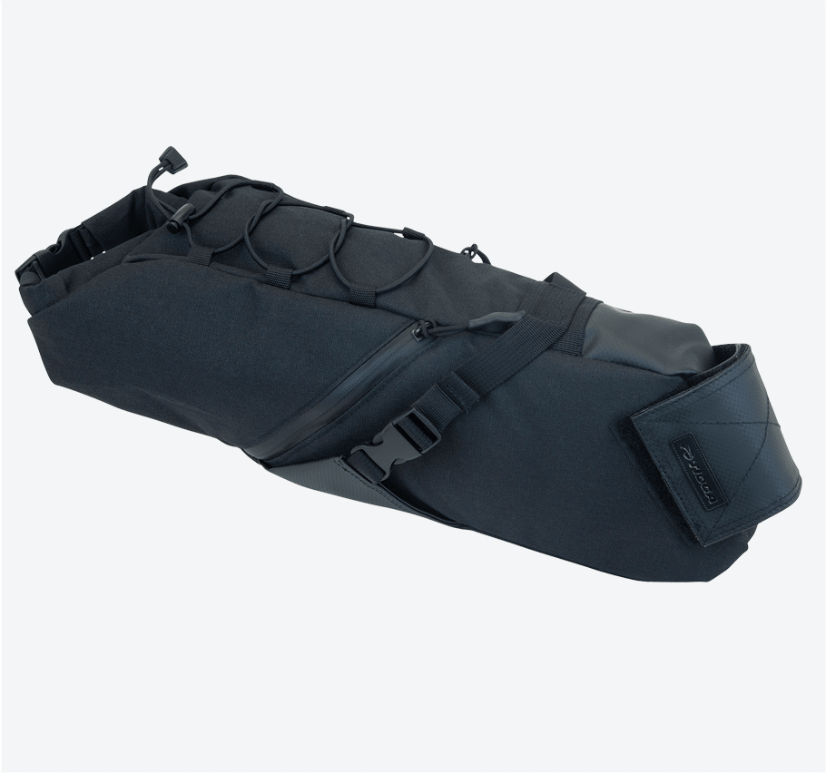 Pack for an ADVenture without adding a rear rack. The ADV Seat Bag easily fastens to the seat post and seat rails with Velcro straps for a secure fit. Back loading 5L storage compartment may be rolled up to adjust to smaller volume. Water proof zipper opening on drive side for easy access to main compartment without unrolling. Additional mesh pocket on non-drive side for storing smaller items. PU coated splash resistant Nylon body for all-weather use.