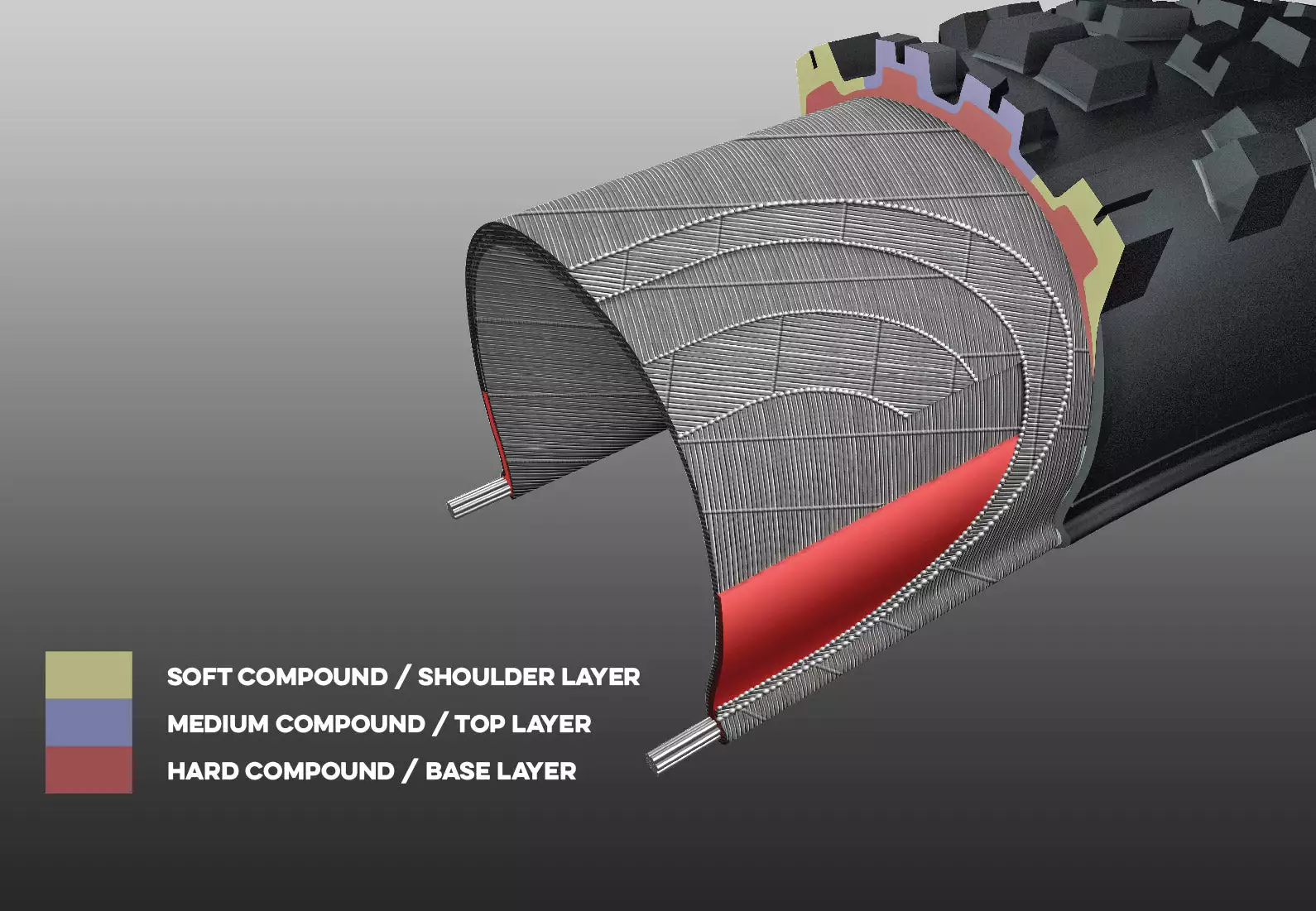 Maxxis 3C Triple Compound mountain technology uses a harder, longer lasting base layer and two progressively softer top layers in order to optimize traction and stability. Maxxis offers three different configurations of our 3C Triple Compound mountain technology: MaxxSpeed, MaxxTerra and MaxxGrip.