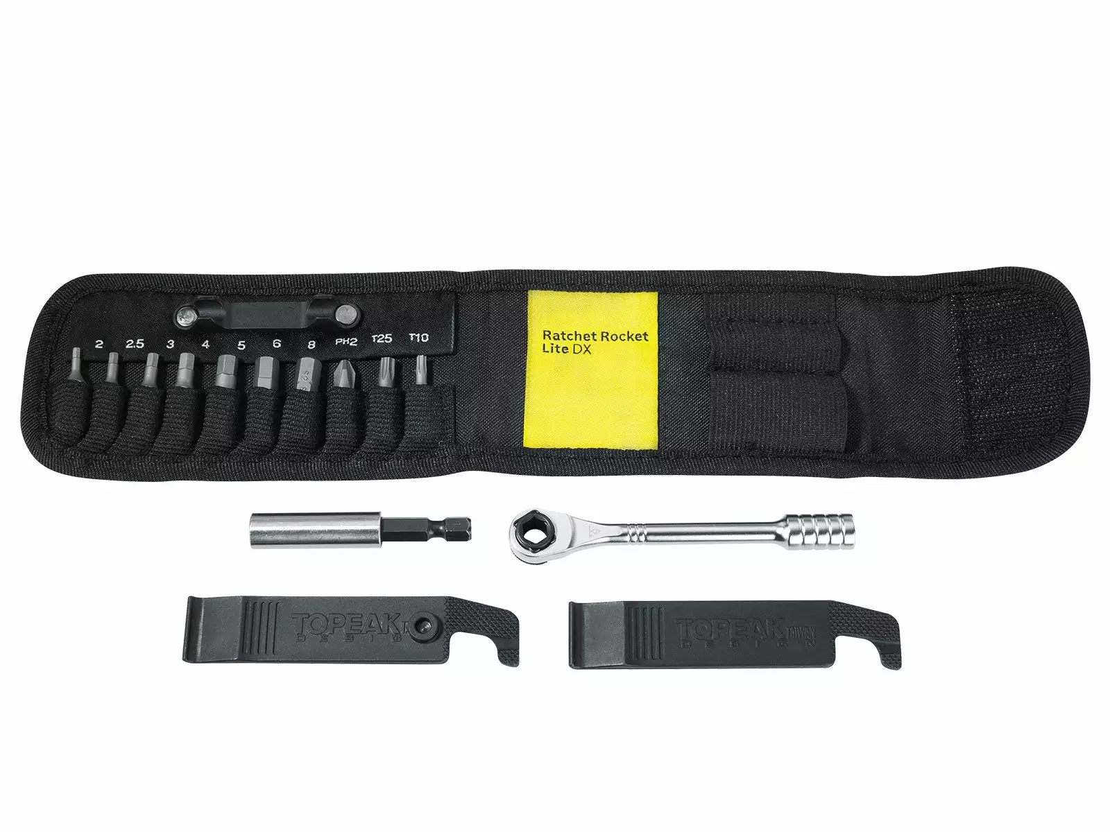 Includes 2, 2.5, 3, 4, 5, 6 and 8mm hex, T10, T25 Torx and #2 Phillips bits, 2 plastic tire levers and magnetic bit holder