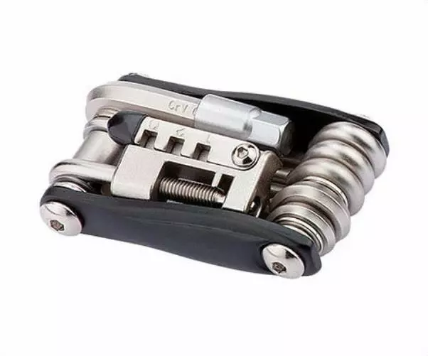 The UltraCycle 14 Function Multi Tool features a sleek thin profile design that could easily be stored in a seatbag or just simply in your pocket. The UltraCycle 14 Function Multi Tool includes a chain tool, 3 common size spoke wrenches, philips screwdriver, flathead scredriver, T25 torx, and 2/2.5/3/4/5/6/8mm hex tools.