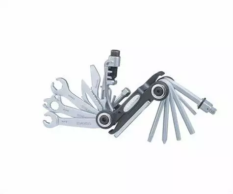 The Topeak Alien II Multi Tool 26 Function features 26 Tools that fold into an engineering grade plastic body for easy carrying. Tools included in the Topeak Alien II Multi Tool 26 Function: 2,2.5,3,4,5,6,&8mm Allen wrenches,8,9,&10mm hex bolt wrenches each 2pcs, mini pedal wrench, Phillips & flat screw drivers, universal chain tool, spoke wrenches for 14g & 15g, 2 tire levers, stainless knife, bottle opener, T25 Tork wrench for disc brakes, 10mm Allen socket for Shimanos new Lx crank bolt and compartment for two chain pins. Clip bag included