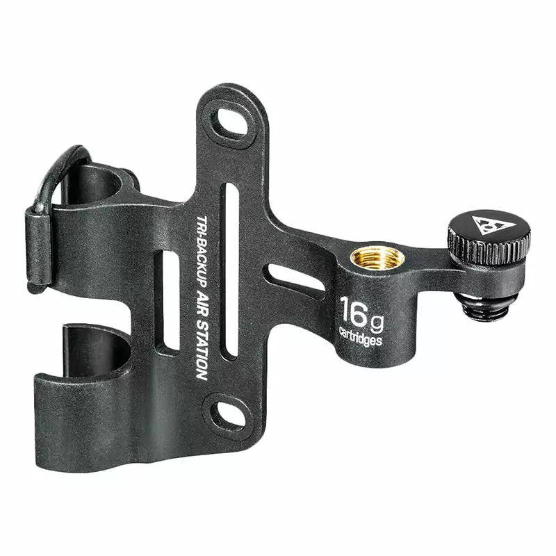 The Tri-BackUp Air Station is an adapter for mounting a CO2 inflator, CO2 cartridges, and a mini pump neatly behind the seat