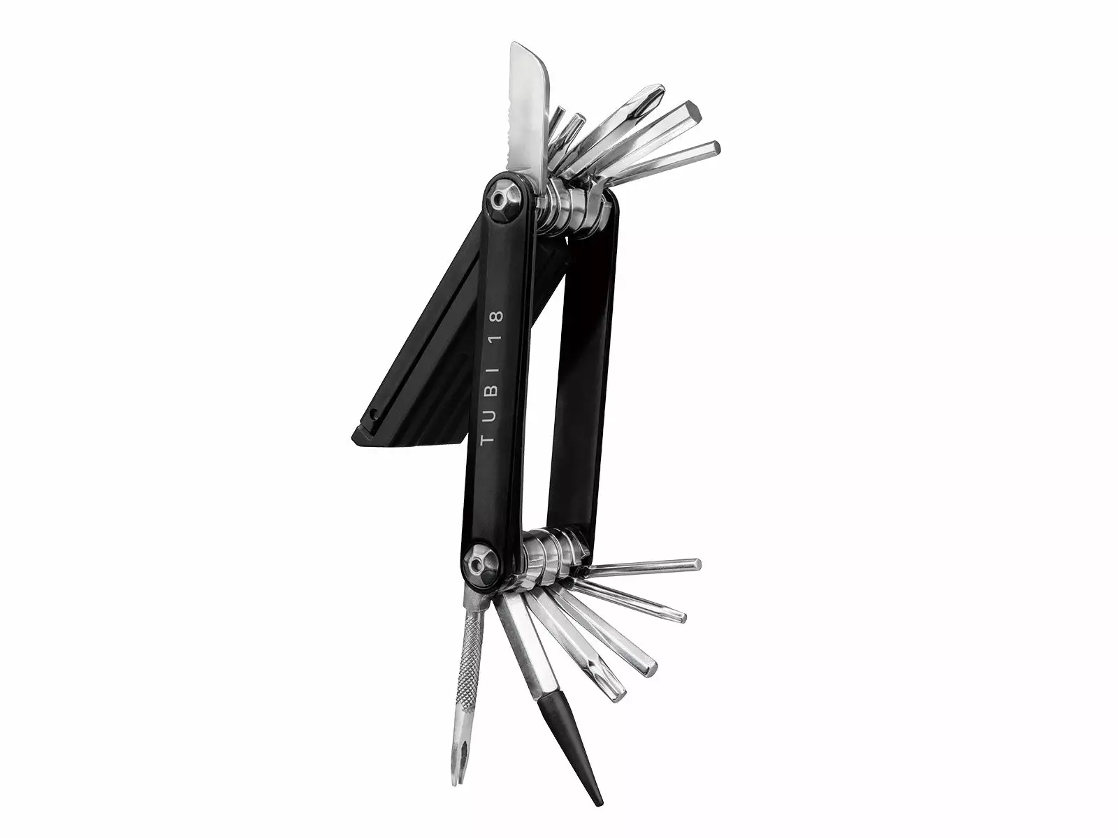 Topeak Tubi 18 Multi Tool. 18 function, pro-quality, precision mini tool with integrated tubeless tire repair functions. Tubeless repair tools and tire repair plug compartment store inside the tool body for a streamlined profile. Perfect for any road or trailside repair.