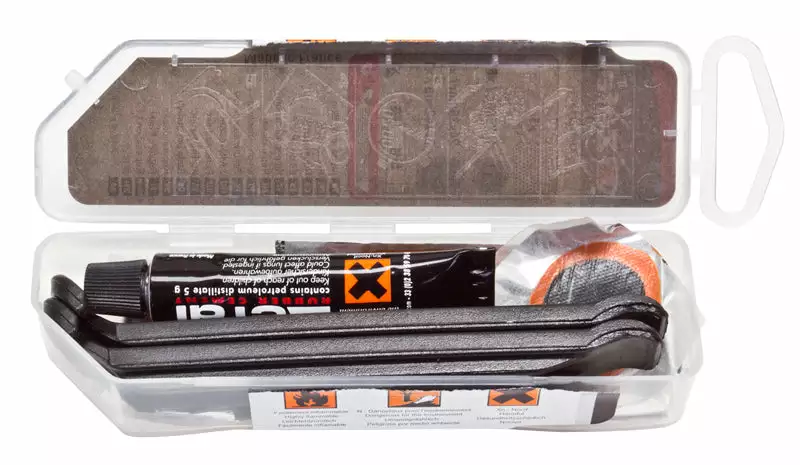 Includes 8 patches, tube of cement, tire levers & sand paper all in plastic case