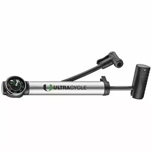 UltraCycle Alloy Hand Thrust Mini Pump w/Gauge. 80PSI 5.5 BAR max pressure. 1.5” gauge. Bicycle mount included. Fits Presta & Schrader valves.