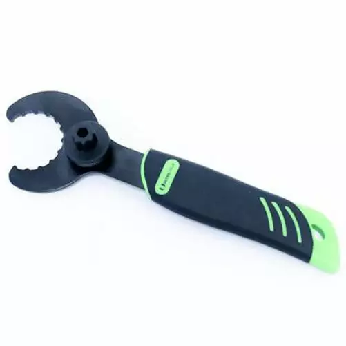 Ultracycle external bottom bracket wrench with installation tool fits Shimano, Campy, GXP, FSA MegaExo external bottom bracket cups. Tighten B.B. cups without removing crankarms. Integrated Shimano end cap tool included.
