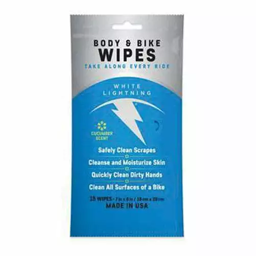 White Lightning Body & Bike Cleaning Wipes cleans greasy hands, removes perspiration and cleans scrapes. Re-sealable for extended use Contains Aloe & Vitamin E, also Hypoallergenic with a fresh cucumber sent. Quickly Cleans Frame & Saddle, Helmet inside and out, Road & trail grime, Nutritional residue, and also works on chrome, plastic, carbon fiber & frames clear coat.