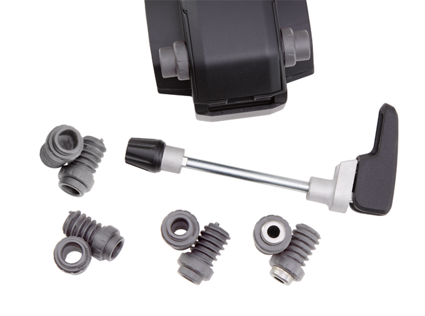 Interchangeable inserts work with most axle configurations including quick release (9 mm) and thru-axles (12 x 100 mm, 15 x 100 mm, 15 x 110 mm, 15 x 135/142/150mm)